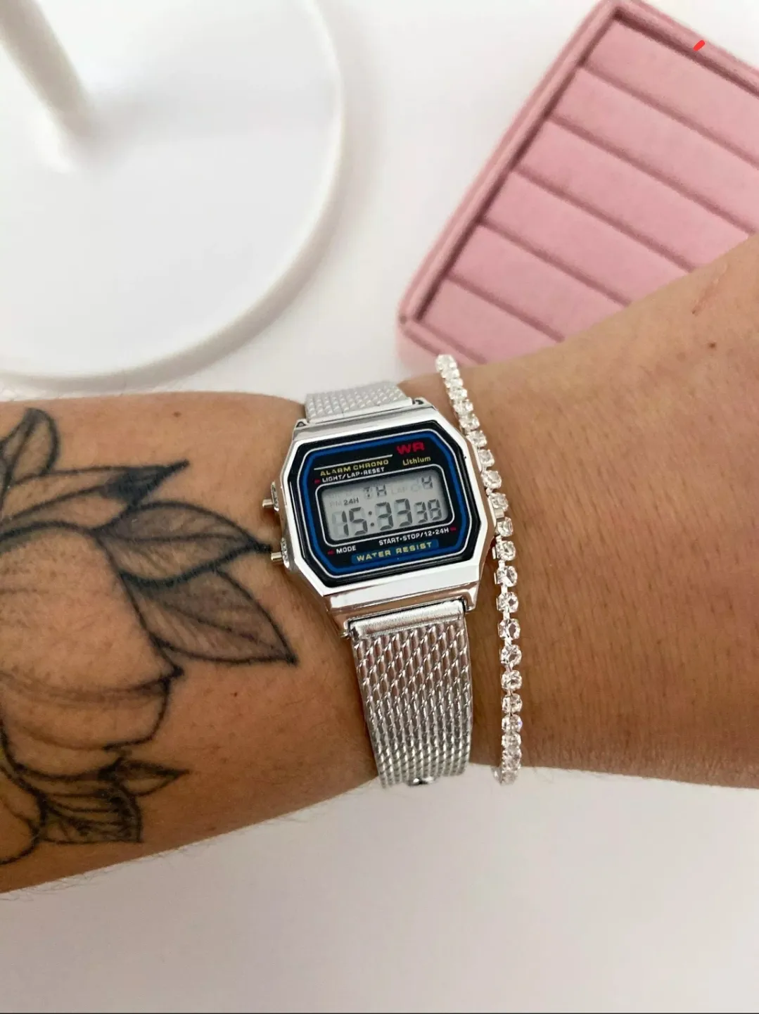 Relógio Retrô Prata com Preto: estilo clássico com toque moderno. Este relógio digital alia design sofisticado em prata e preto com pulseira de silicone confortável e resistente. Com praticidade e charme.