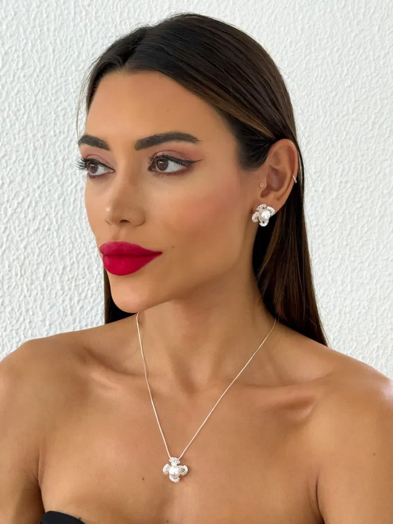 Conjunto Pérolas Com Pétalas Cravejadas - Prata